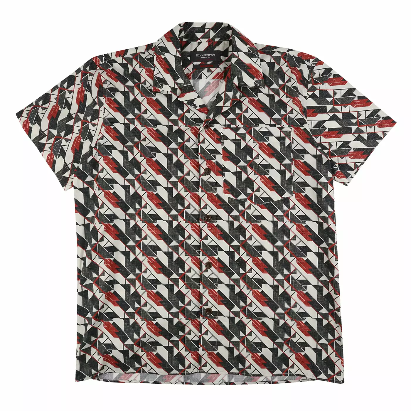 The Kintra is our first short-sleeved shirt! Stand out from the crowd with our signature geometric camouflage. A standard fit with camp collar and chest pocket the Kintra is a summer weight cotton for warmer days and is finished with corozzo buttons and Finnieston detailing.