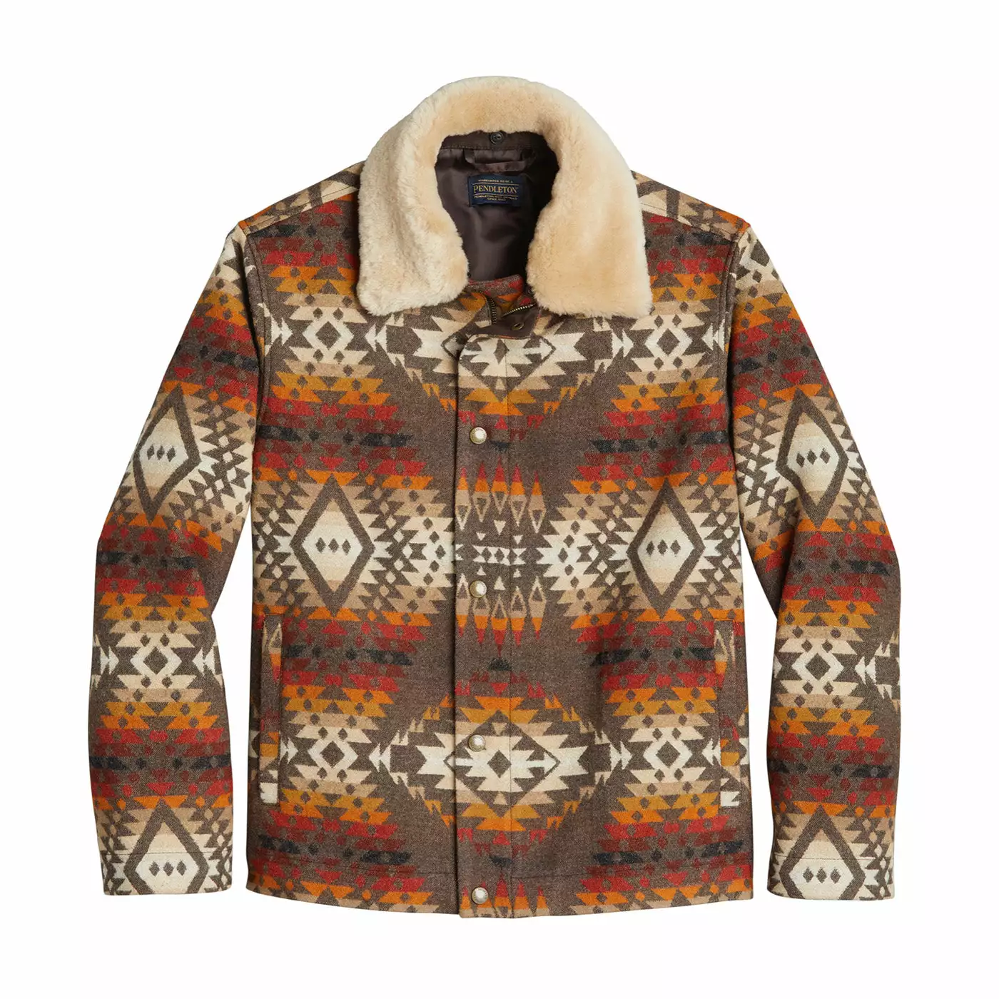 Pendleton’s Mission Trails pattern is showcased on a brand-new men’s wool coat, with removable shearling-lined collar for added versatility. Crafted of blanket-weight, woven-in-USA wool that’s naturally resistant to wind, water and stains. Zip/snap closure, two welt pockets. Lined.